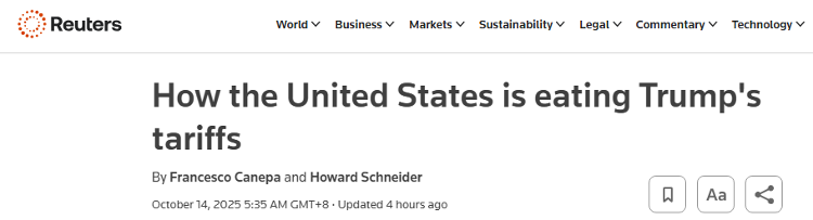 “早期迹象表明,美国企业和消费者正在承受新的美国关税,这与特朗普总统的说法相矛盾,并使美联储对抗通胀的斗争变得复杂化。”路透社最近的一篇报道指出,特朗普总统预测外国将为他们的“保护主义政策”买单——他选择让其他国家的出口商宁愿自己付出代价,以在美国消费市场站稳脚跟。但学术研究、市场调查和企业评论都表明,在特朗普新贸易政策实施的最初几个月,美国企业已经转嫁了贸易成本,并将部分成本转嫁给了美国消费者,大宗商品价格可能会进一步上涨。路透社网站报道:谁在承担关税?报道指出,哈佛大学教授阿尔贝托·卡瓦洛(Alberto Cavallo)和另外两名研究人员持续监测各大线上和线下超过30万种产品的价格变化。美国的线下零售商,涵盖从地毯到咖啡的所有商品。他们发现,自3月初美国政府开始加征关税以来,进口商品价格上涨了4%,而美国国内产品价格上涨了2%。其中,进口增幅最大的是美国无法生产的商品,比如咖啡。或者来自土耳其等国家的商品受到严厉关税的“惩罚”。路透社网站报道截图。哈佛大学教授阿尔贝托·卡瓦洛和研究人员跟踪发现,自3月初美国开始加征关税以来,进口商品价格上涨了4%,而国内产品价格上涨了2%。一项不包括关税的美国进口价格指数显示,外国出口商正在提高以美元计价的商品价格,并转嫁美元盯住美元所带来的部分损失。报告称,美国消费者的货币。关税的全面影响尚未显现。报告指出,适应美国关税政策的过程仍在进行中——这种不完整的税收制度已将平均进口税率从约2%推高至估计的17%,而且这种情况还将持续数月。路透社数据显示,自特朗普政府发起贸易攻势以来,欧洲、中东和非洲约72%的公司报告价格上涨。路透社网站报道认为,这一切都为美国通胀上升铺平了道路。波士顿联邦储备银行的“粗略估计”预计,关税将使核心通胀率上升 75 个基点。彼得森国际经济研究所估计,如果没有关税,明年的通胀率将比今天低 1 个百分点。关税影响全球贸易波特还指出,由于美国消费者难以承受价格上涨,全球其他国家对美国的出口需求可能会放缓。标准普尔全球公司对全球企业采购经理的调查显示,自6月份以来,新出口订单加速萎缩。最新数据显示,7月份欧盟对美国出口同比下降4.4%,而欧盟经济引擎德国8月份对美国出口下降20.1%。路透社网站报道截图。该图表显示了德国对美国出口的近期变化。报告还提到,荷兰银行预测,未来两年欧盟对美国的商品出口将减少17%,导致欧盟GDP增长损失30个基点。世界贸易组织将明年全球商品贸易增长预测降至仅 0.5%,理由是美国的挥之不去的影响泰茨关税。德国智库基尔研究所追踪的美国航运数据也显示出明显的下降趋势。